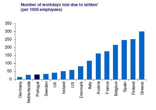 De acordo com a publicação acima referida, Portugal é um dos países com menos dias de trabalho perdidos por causa das greves, no periodo entre 2000 e 2007. Há pois mais retórica nas lutas sindicais do que acção propriamente dita. Anunciam-se greves, sindicatos e patrões digladiam-se nas contas e o resultado é apenas este: cerca de 25 dias de faltas grevistas por cada mil trabalhadores!